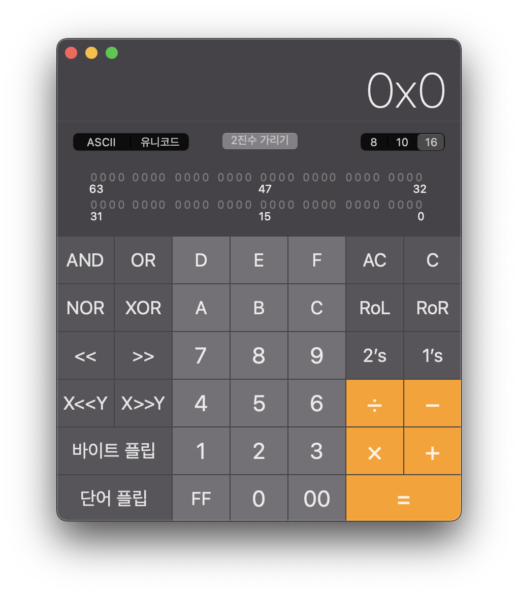 맥에서 계산기를 실행 후 Cmd 3 을 누르면 프로그래머 계산기로 바뀐다.