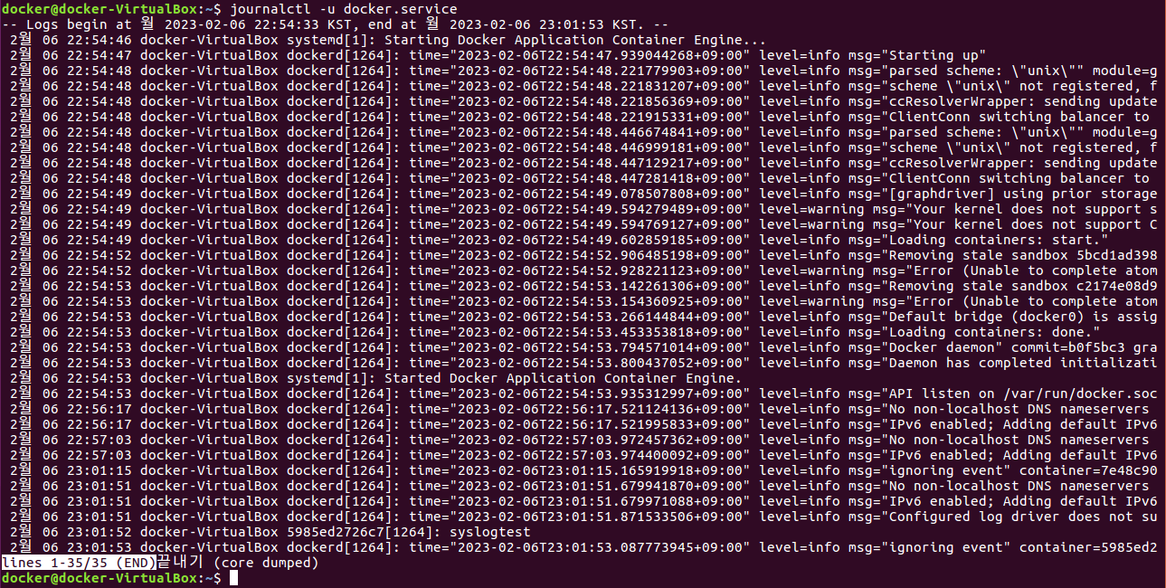 컨테이너의 커맨드가 echo syslogtest 로 설정되기 때문에 이 문구를 출력하고 컨테이너는 종료될 것입니다.