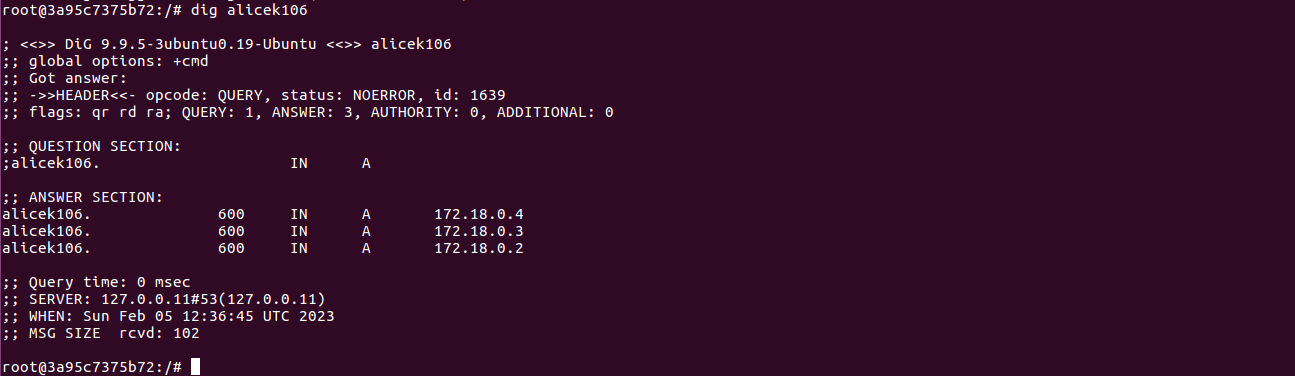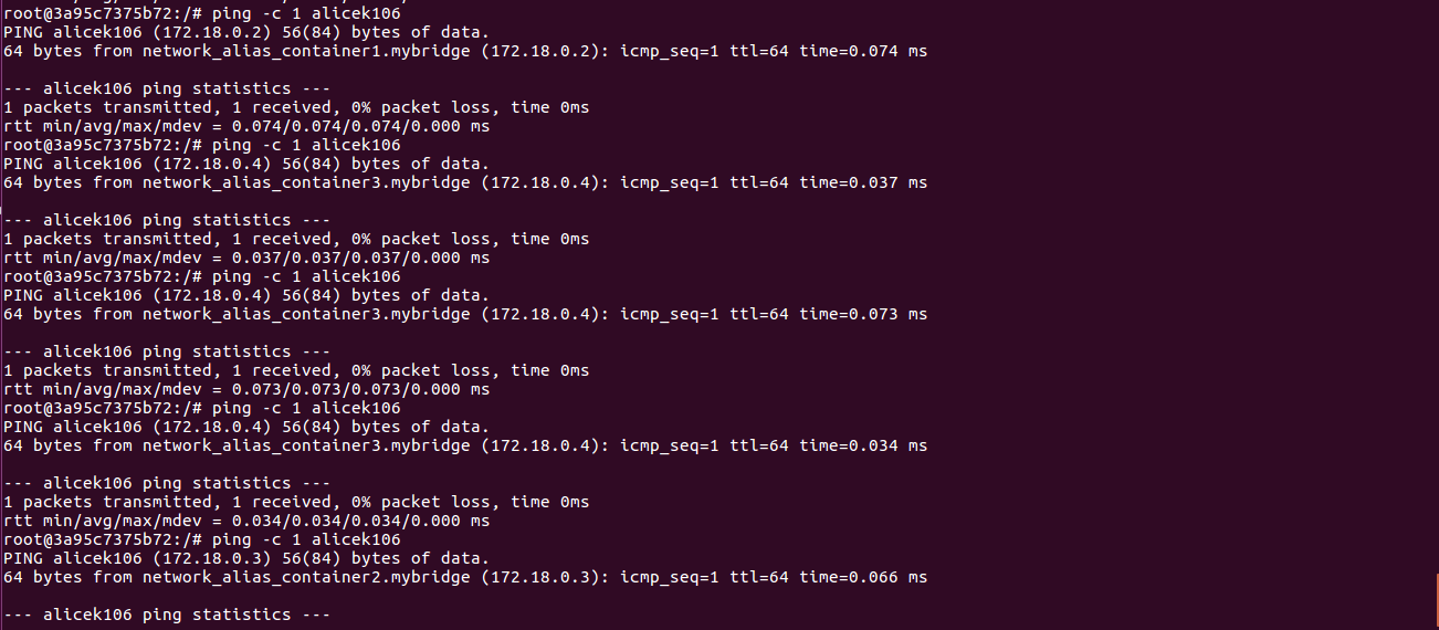 mybridge 라는 이름의 네트워크에 속한 3개의 컨테이너는 run 으로 생성할 때 --net-alias 옵션에 alicek106 이라는 값을 입력했으며, 이 컨테이너의 IP 는 DNS 서버에 alicek106 이라는 호스트 이름으로 등록됩니다.