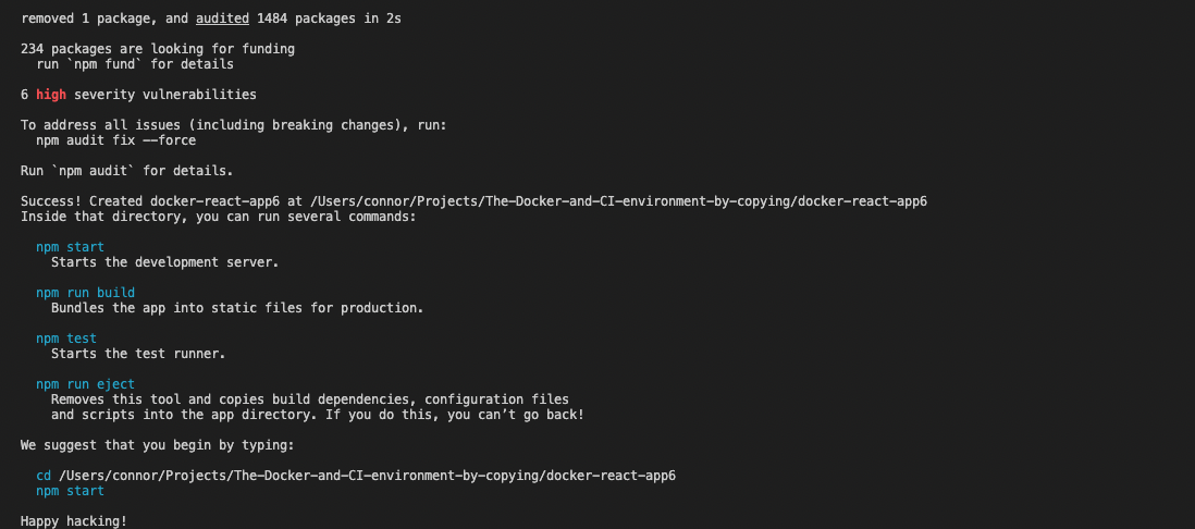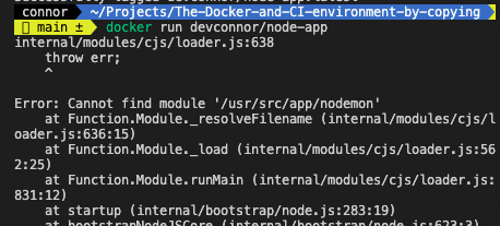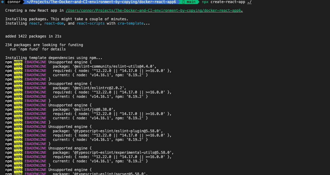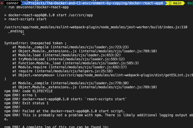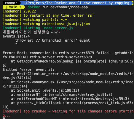 - '-e CI=true' 부분이 없으면 에러가 발생합니다.
