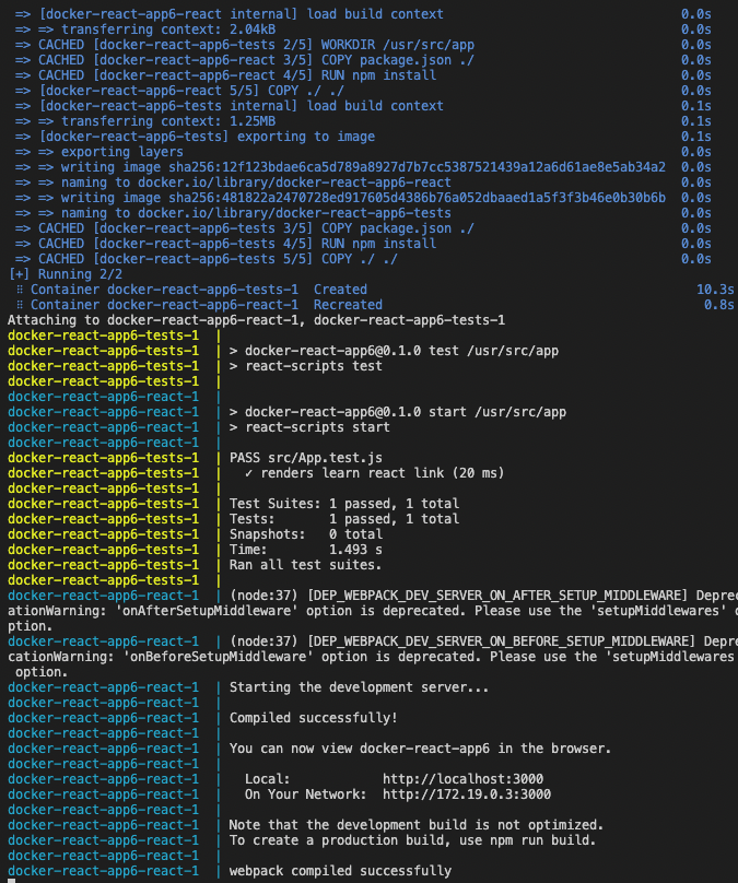 리액트를 테스트하는 부분은 개발환경에서만 필요하기 때문에 테스트를 위한 컨테이너는 필요하지 않습니다.
