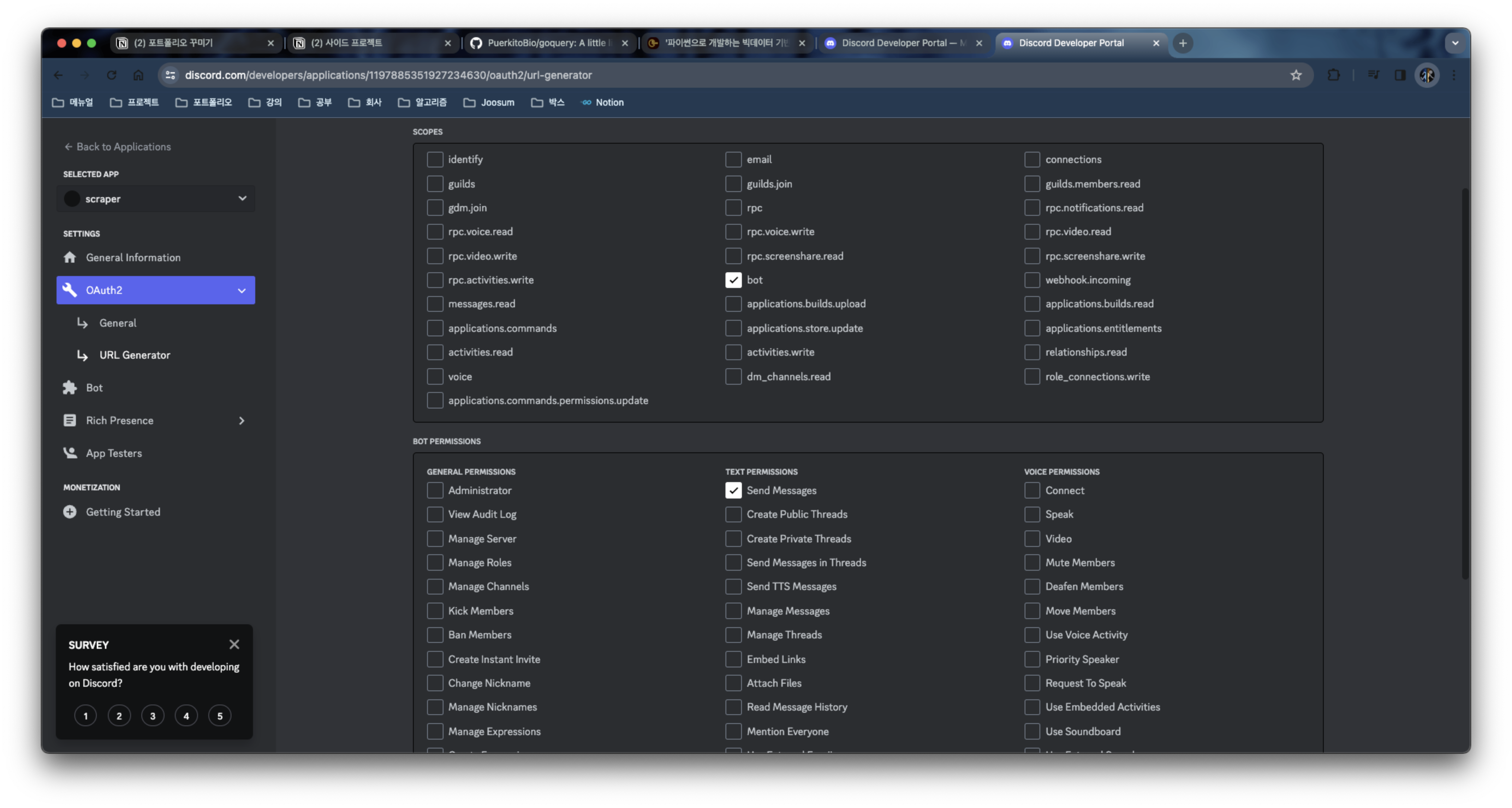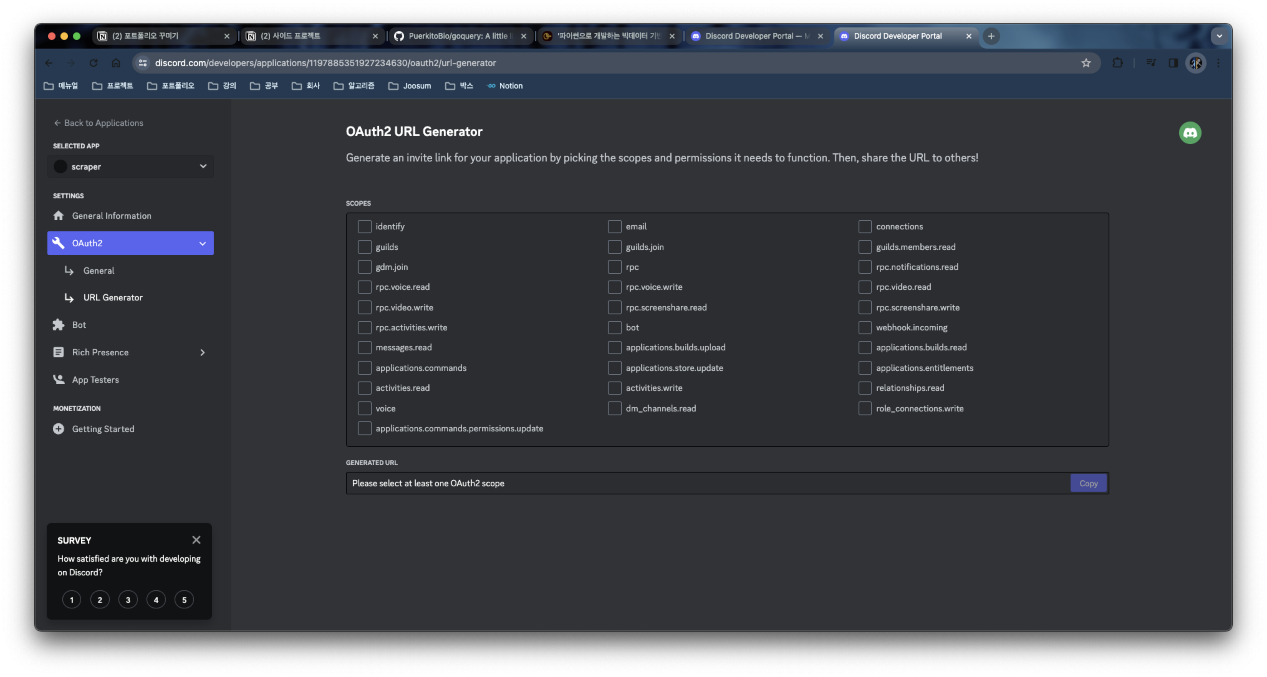 OAuth2 로 이동 후 URL 제네레이터로 이동한다.