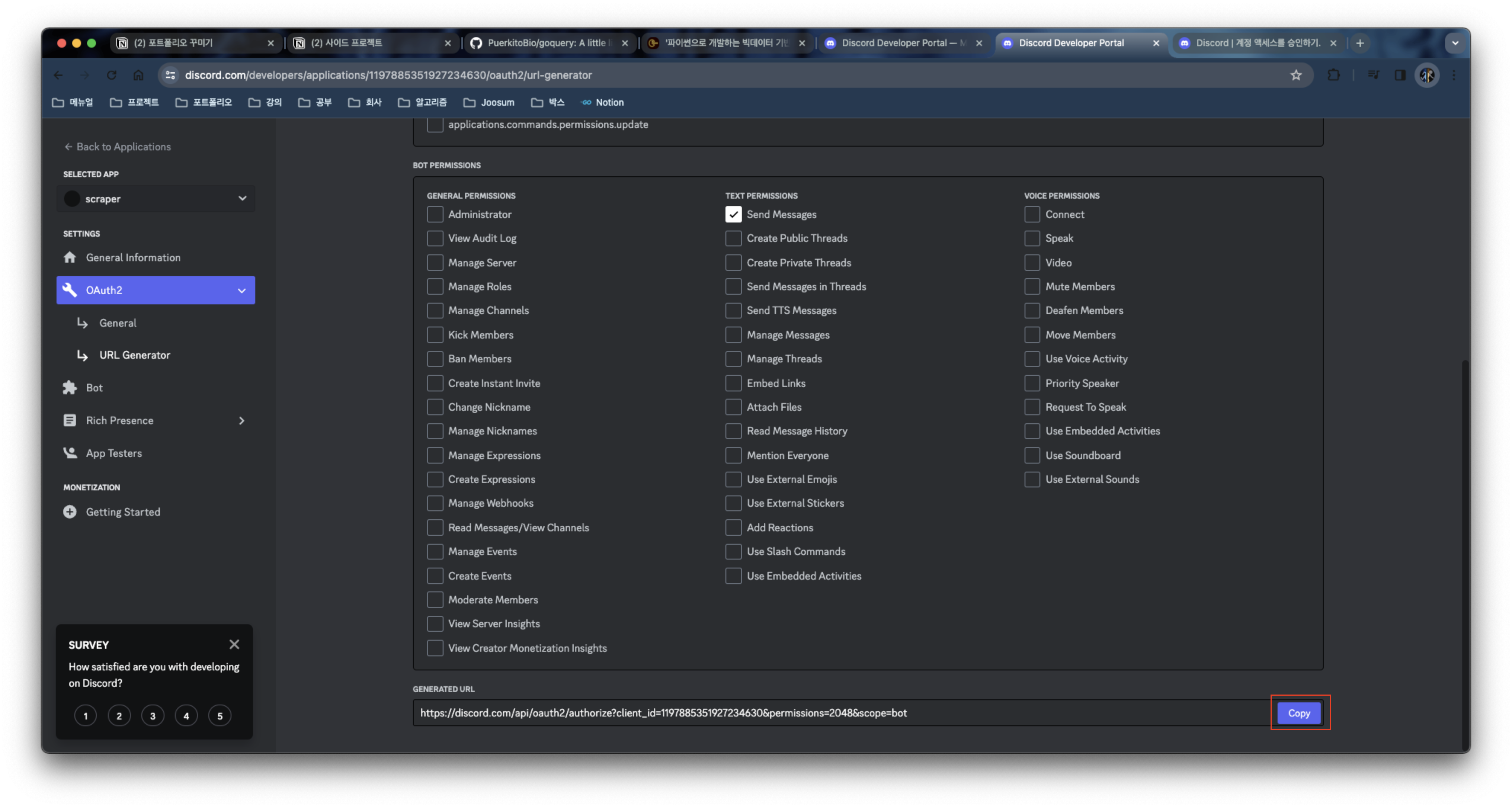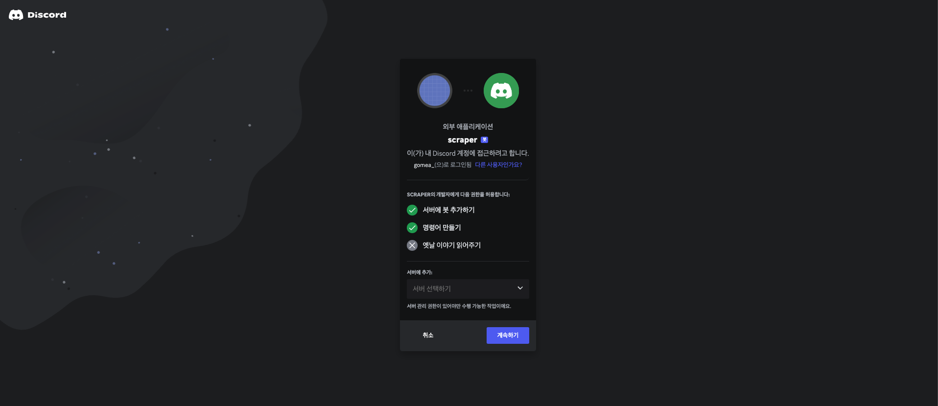 아래 url 을 복사해 새로운 링크로 열면 봇을 서버에 추가할 수 있다.