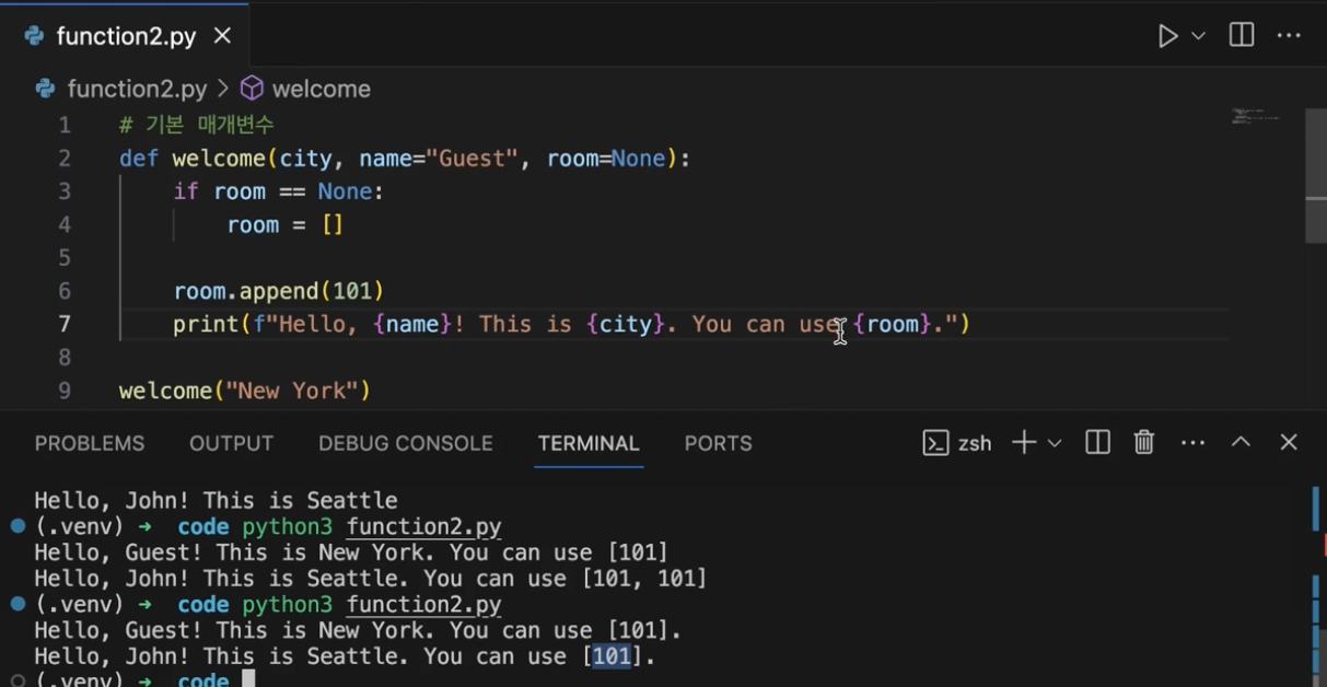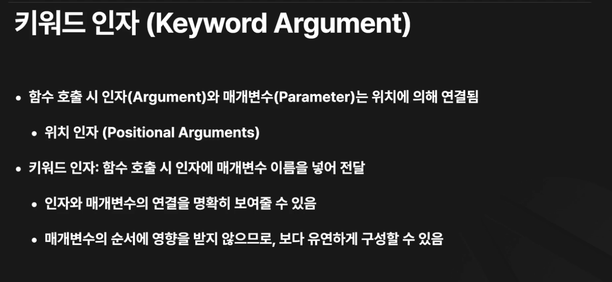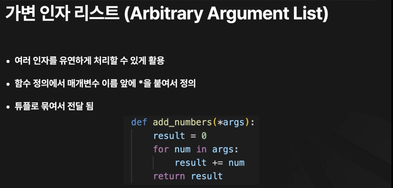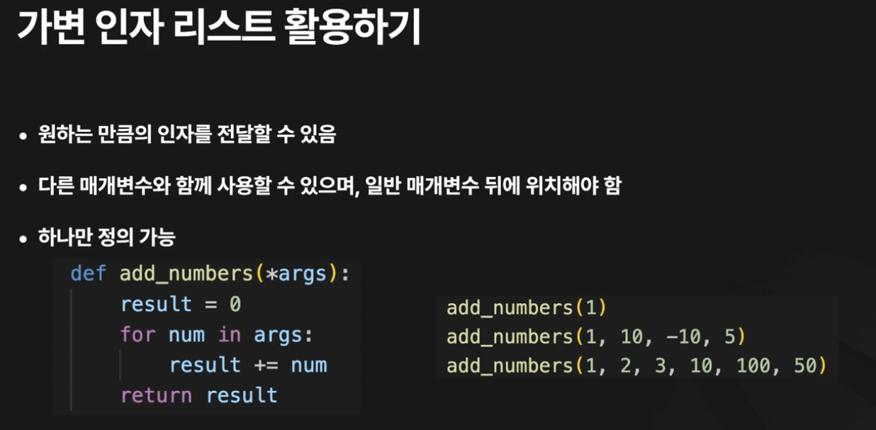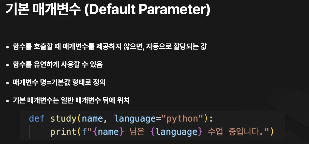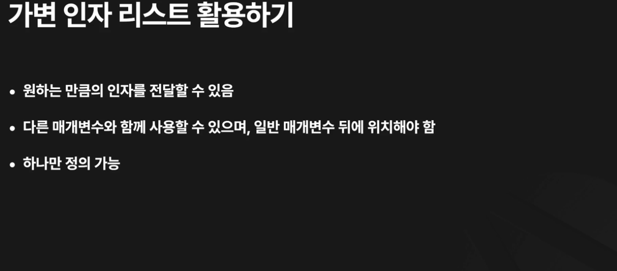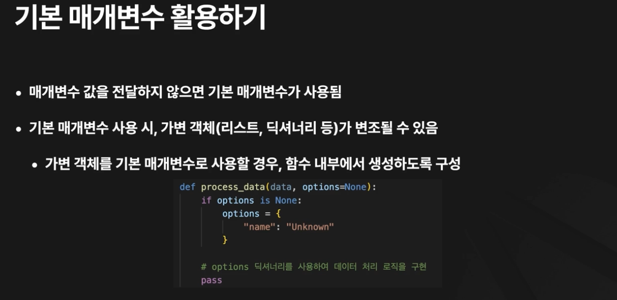 - 기본 매개변수에는 가변객체를 넣을 때 조심하자.