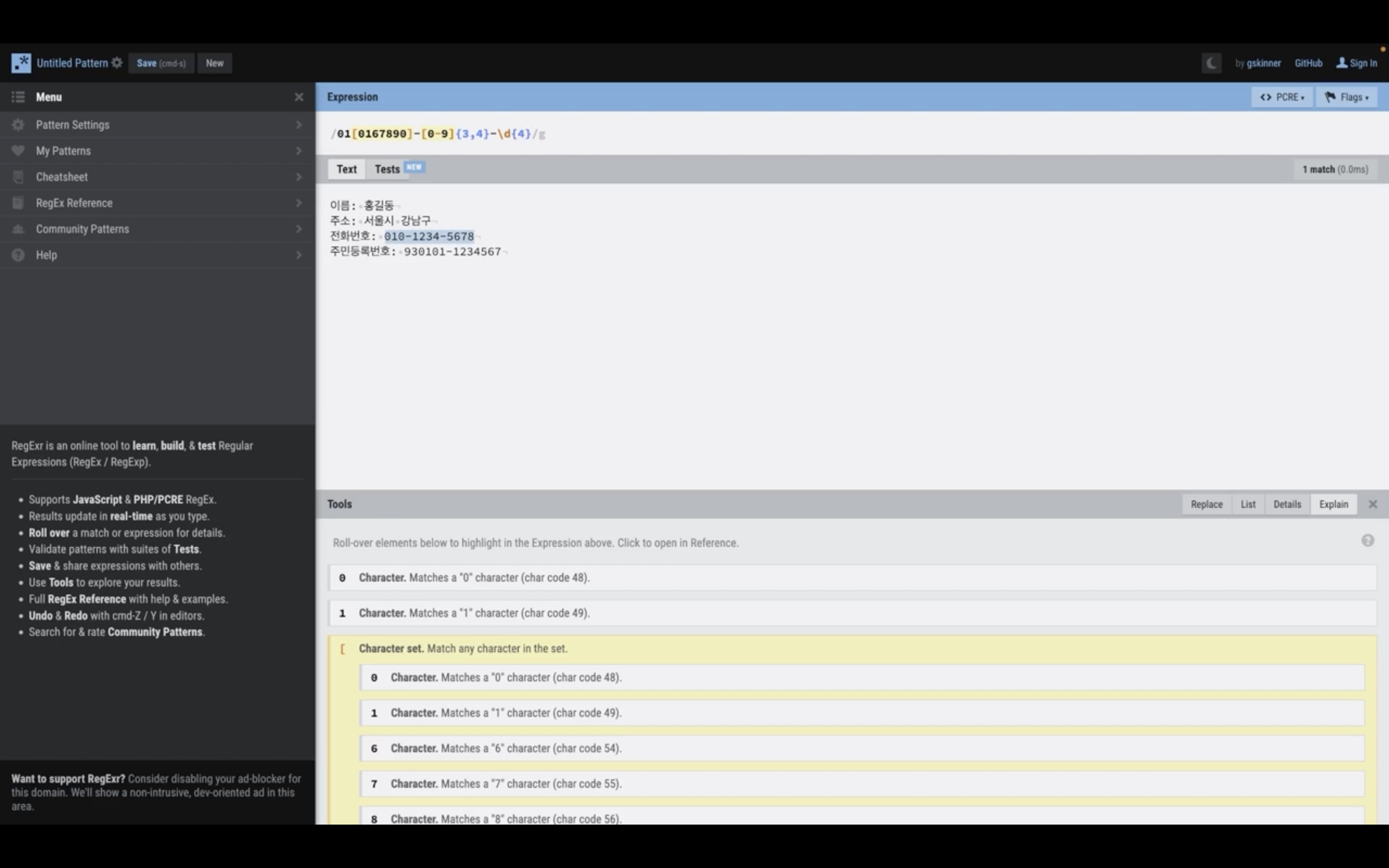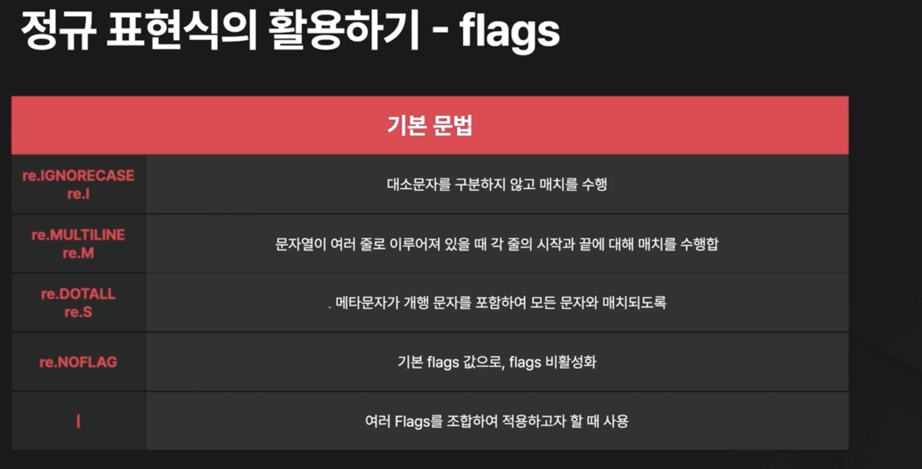 파이썬에서 플래그를 썼던 것 처럼 /i (대소문자 구문 x) 플래그를 넣을 수 있다.