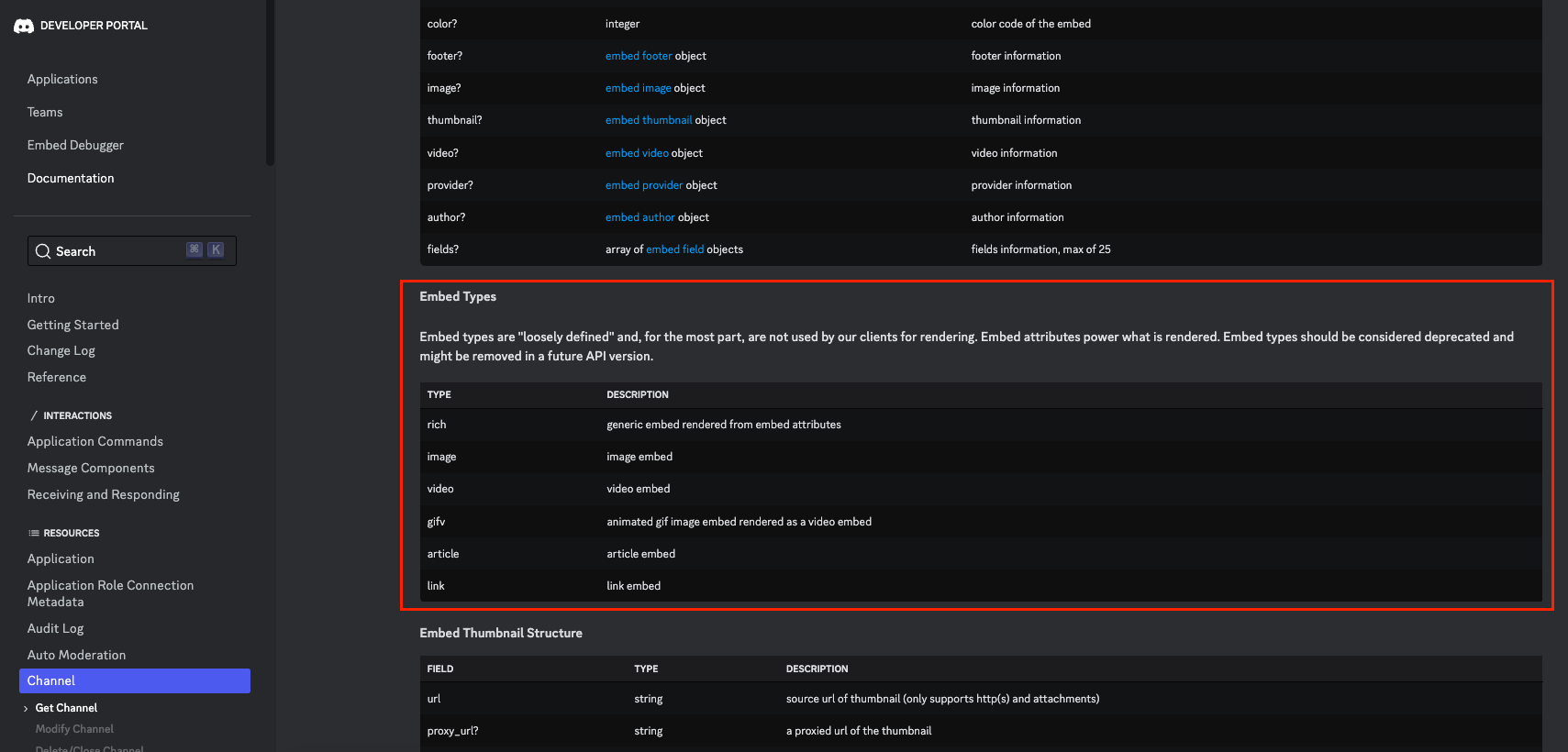 디스코드 메뉴얼에서 embed 타입의 종류를 볼 수 있다.