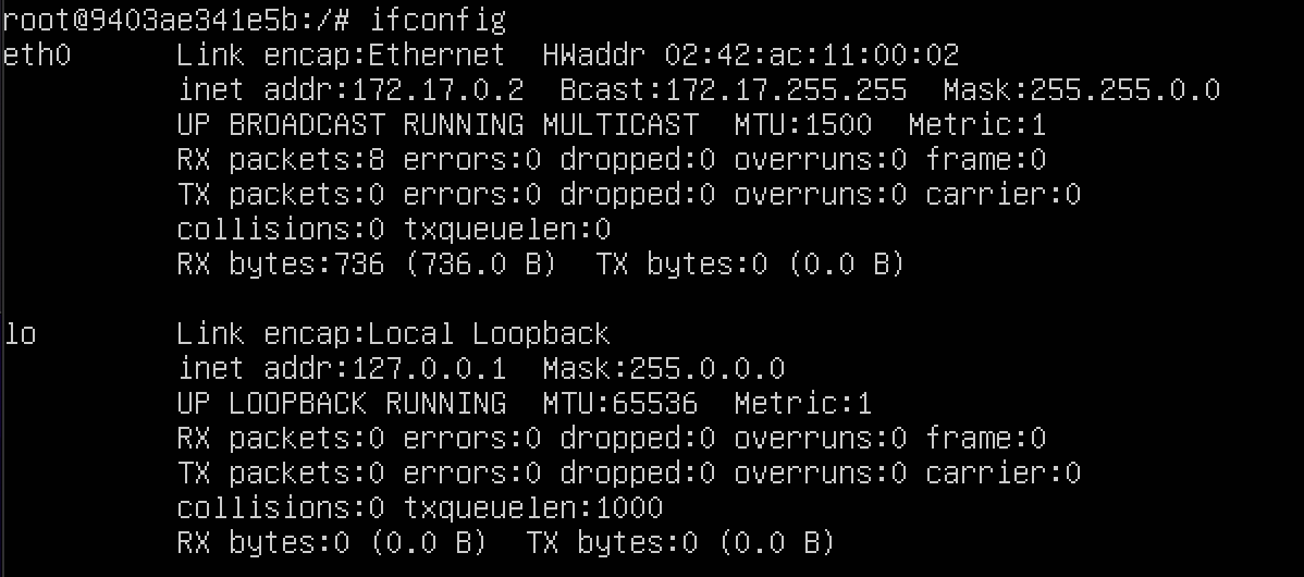 기본적으로 도커는 컨테이너에 172.17.0.x 의 IP 를 순차적으로 할당합니다.ifconfig 로 컨테이너의 네트워크 인터페이스를 확인합니다.